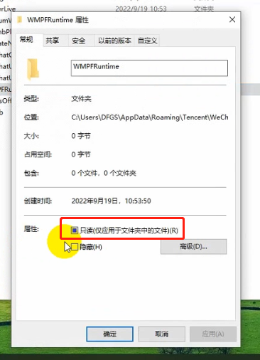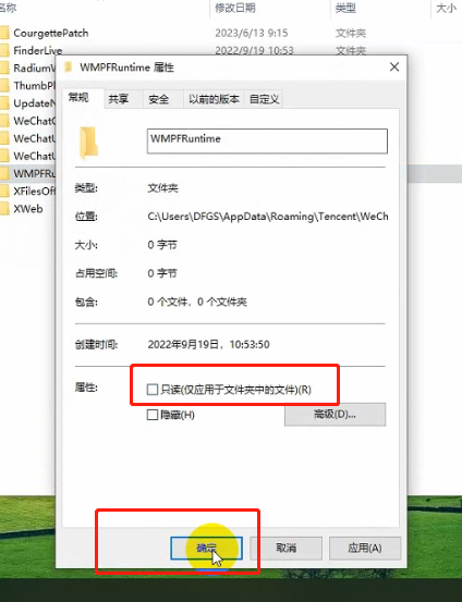 找到WMPFRuntime文件夹,右击 - 属性,取消 只读 的复选框,点击 确定 。