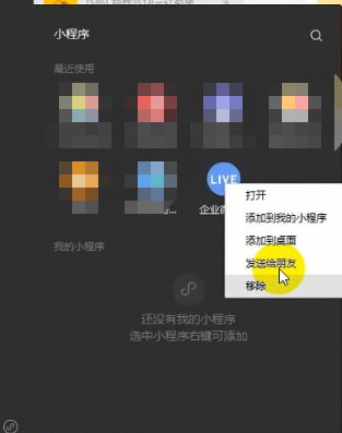 4. 打开微信,打开小程序面板,对异常的小程序右击,点击移除。
